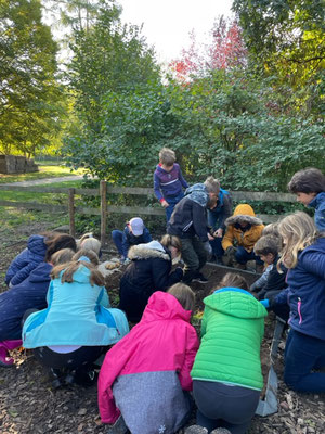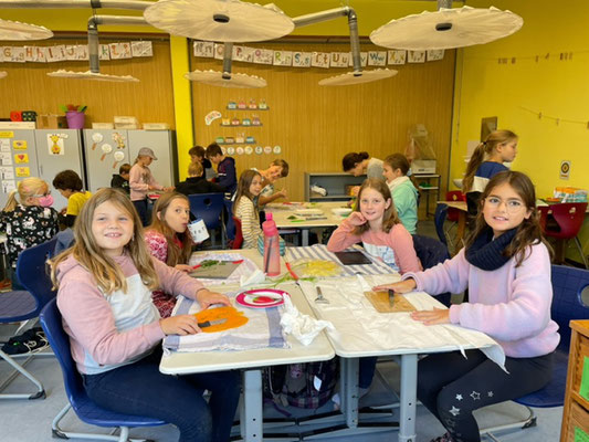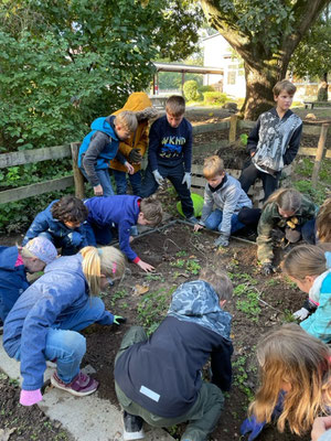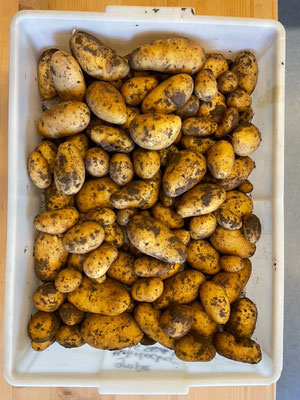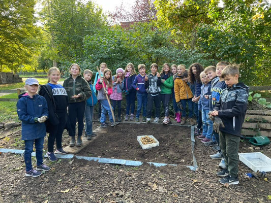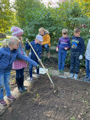 Dazu begaben wir uns vor der großen Pause in den Schulgarten und begannen unsere Kartoffeln aus unserem Klassenbeet auszubuddeln. Wir arbeiteten hier wie die Menschen früher, nur mit unseren Händen und einer Heugabel. Insgesamt ernteten wir eine Kiste mit kleinen, aber auch vielen großen Kartoffeln, die wir dann in unserem Klassenzimmer zubereiteten.