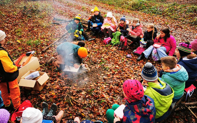 Als erstes spielten wir ein Namensspiel, wir haben zu unserem Anfangsbuchstaben ein Waldtier gesucht. Anschließend machte der Förster ein Feuer. Wir saßen auf Stämmen, die wir selbst gesucht hatten und haben gefrühstückt. Als alle Kinder fertig waren, spielten wir ein Spiel namens „Reh und Wolf“.